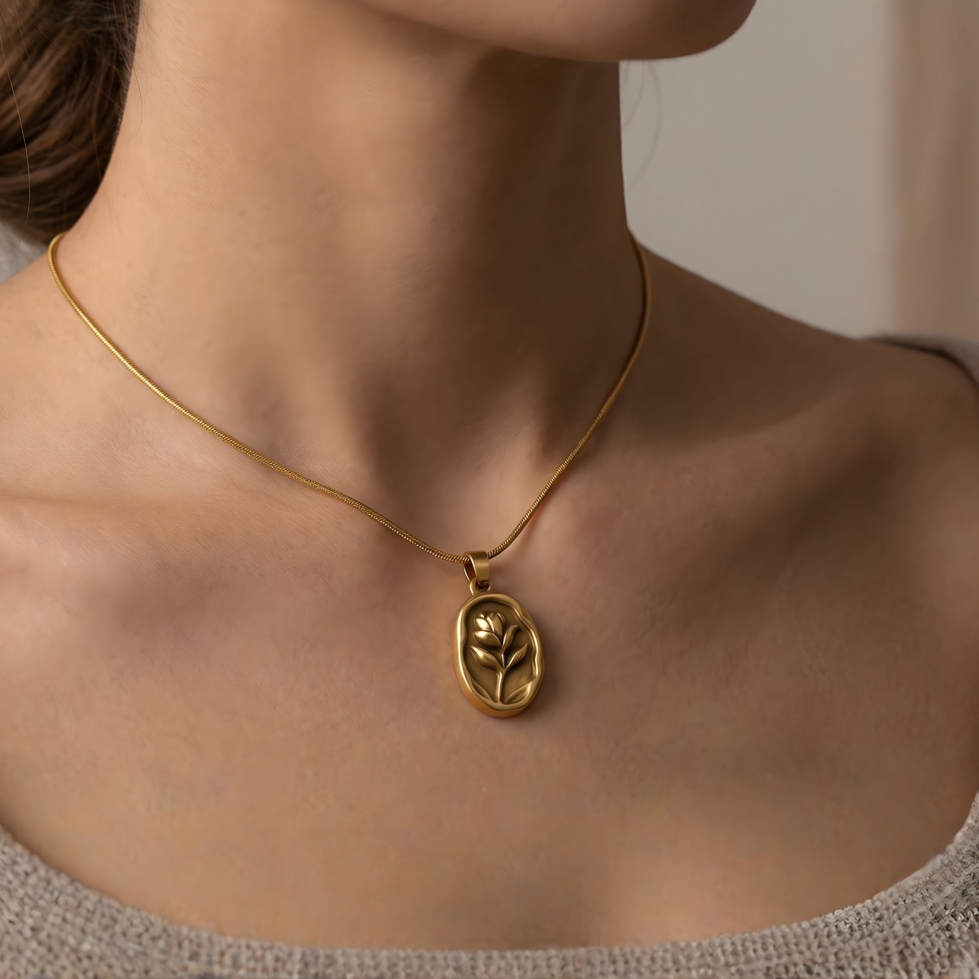 VIRELLE is inspired by vintage emblems and modern femininity a sculpted gold medallion featuring delicate floral detailing, suspended from a sleek, fluid chain.